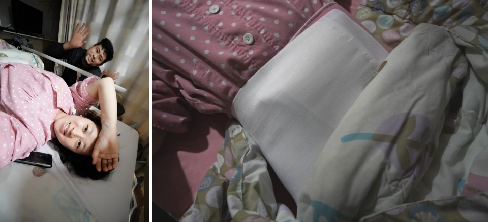 움직이지 못해서 간이침대에서 곤히 잠든 남편을 깨우며 모래 주머니 치울 시간이라고 알려 주었다.