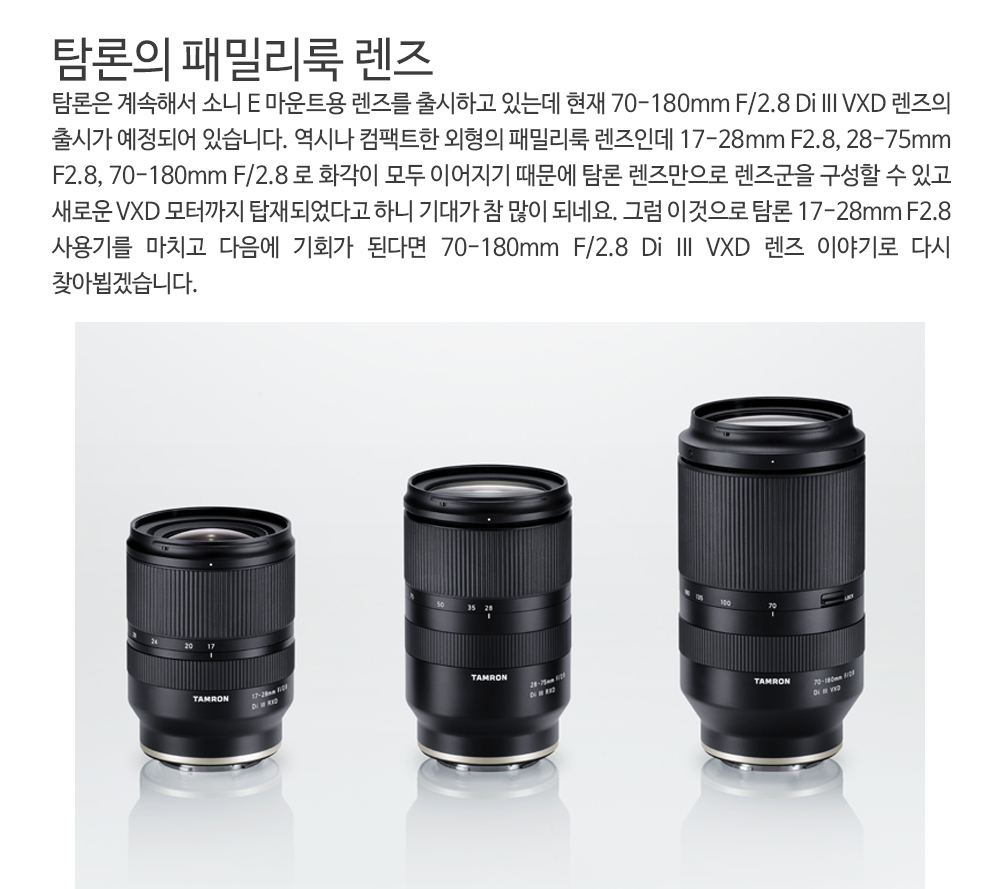 탐론에서 28-75mm F2.8 렌즈에 이어서 패밀리룩으로 출시한 탐론 17-28mm F2.8 렌즈는 소니 풀 프레임 미러리스 카메라에 호환되는 광각 줌렌즈입니다.