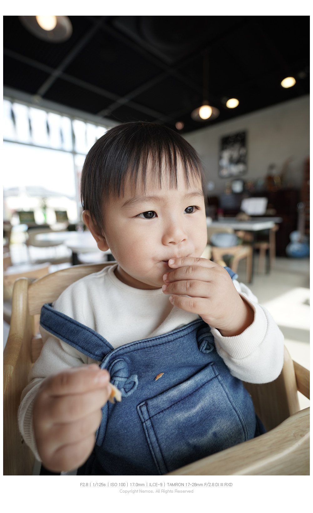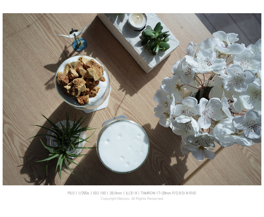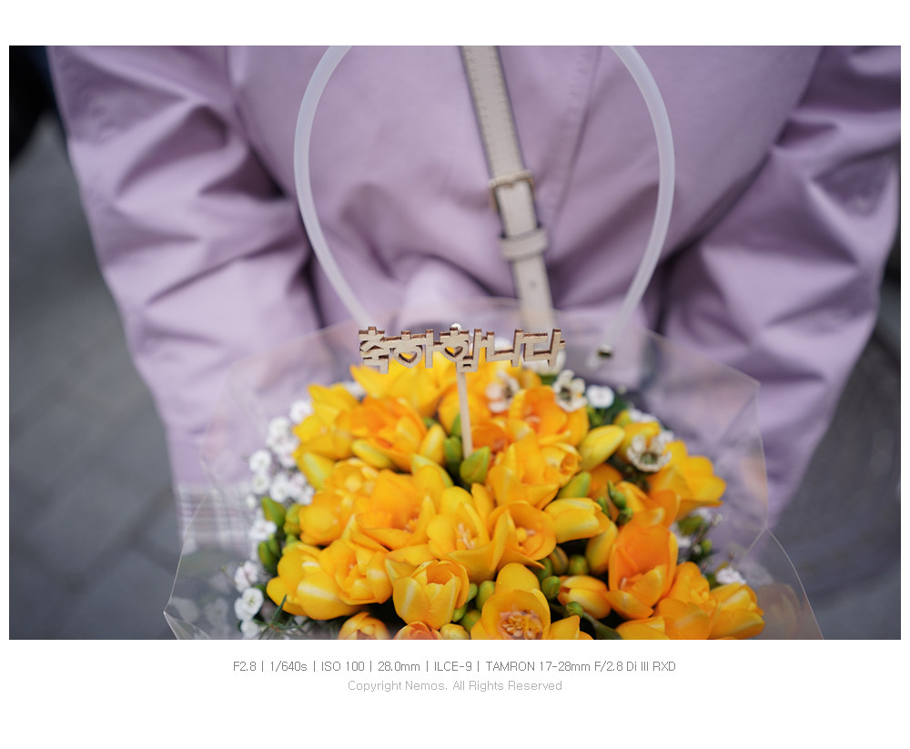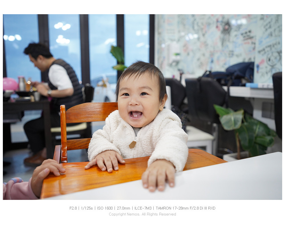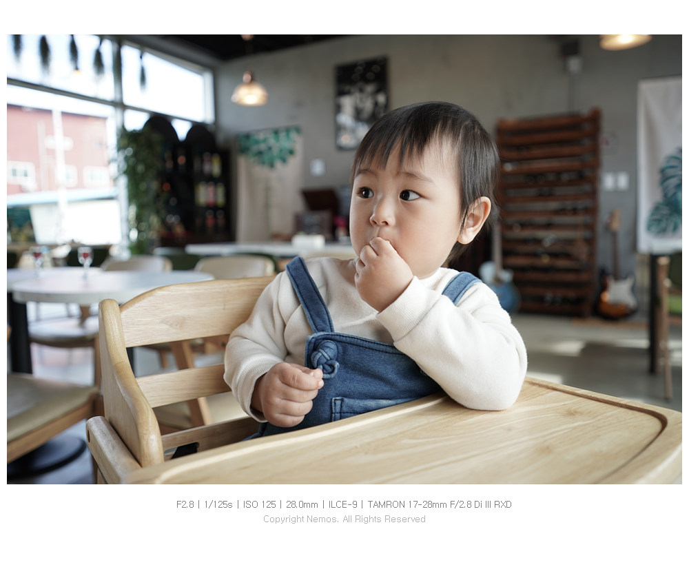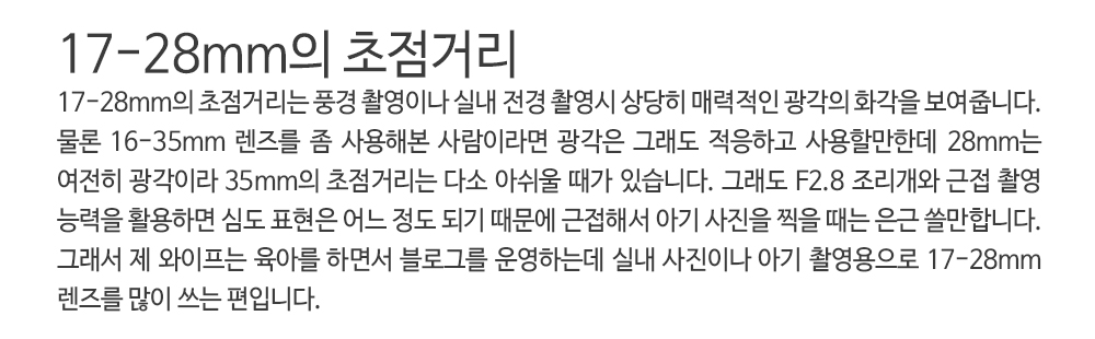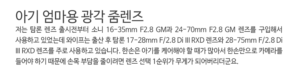 작고 가벼운 외형에 F2.8의 개방 조리개 값을 갖고 있어서 육아와 사진을 함께하고 있는 와이프에게 특히나 매력적이며, 서드파티 렌즈로 렌즈군을 구성하고자 하는 소니 풀 프레임 카메라 사용자들에게 좋은 대안이 되는 렌즈입니다.